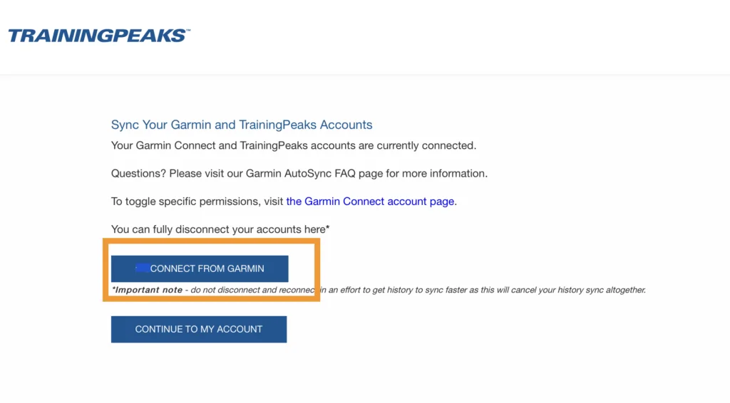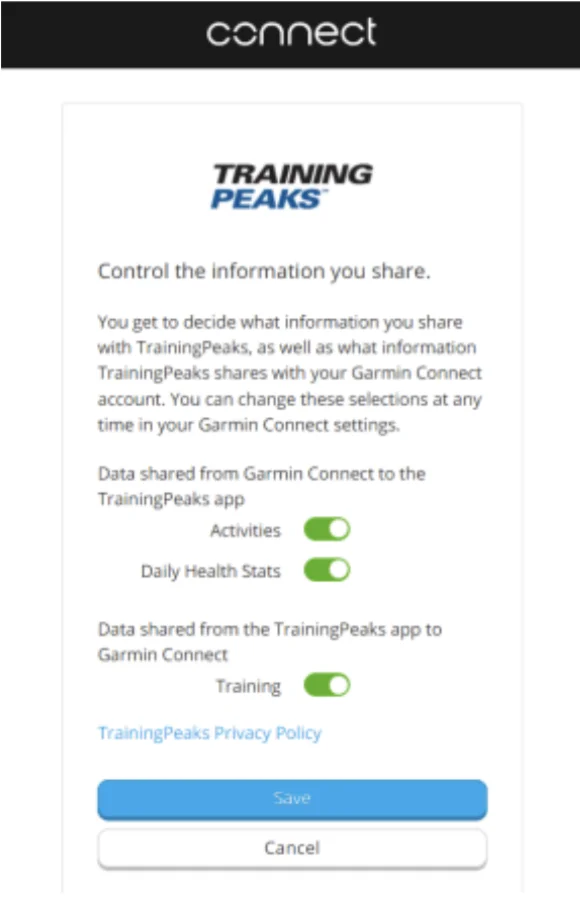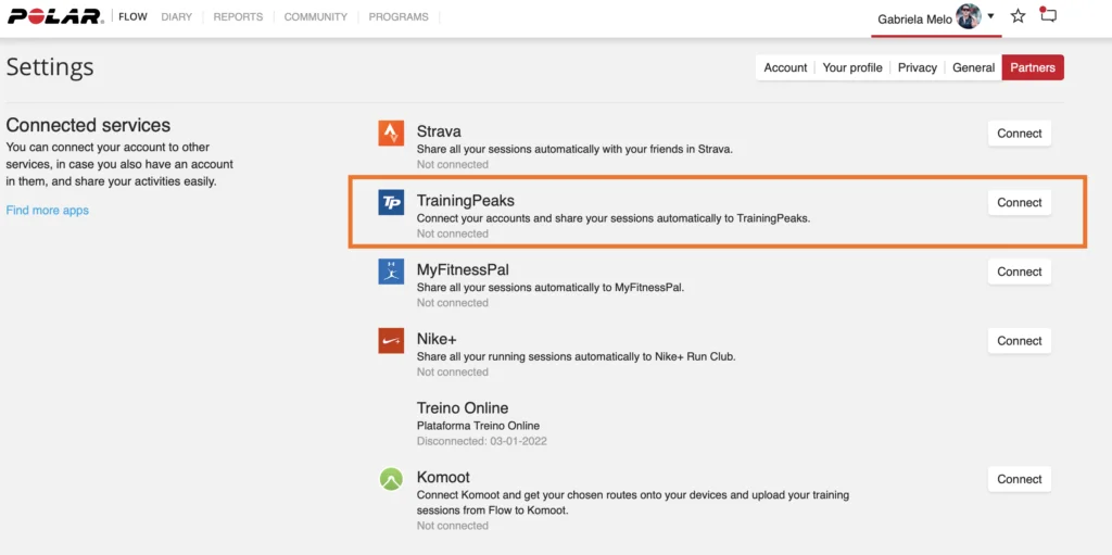 • Escolha a opção “connect” no botão ao lado do símbolo do Training Peaks;