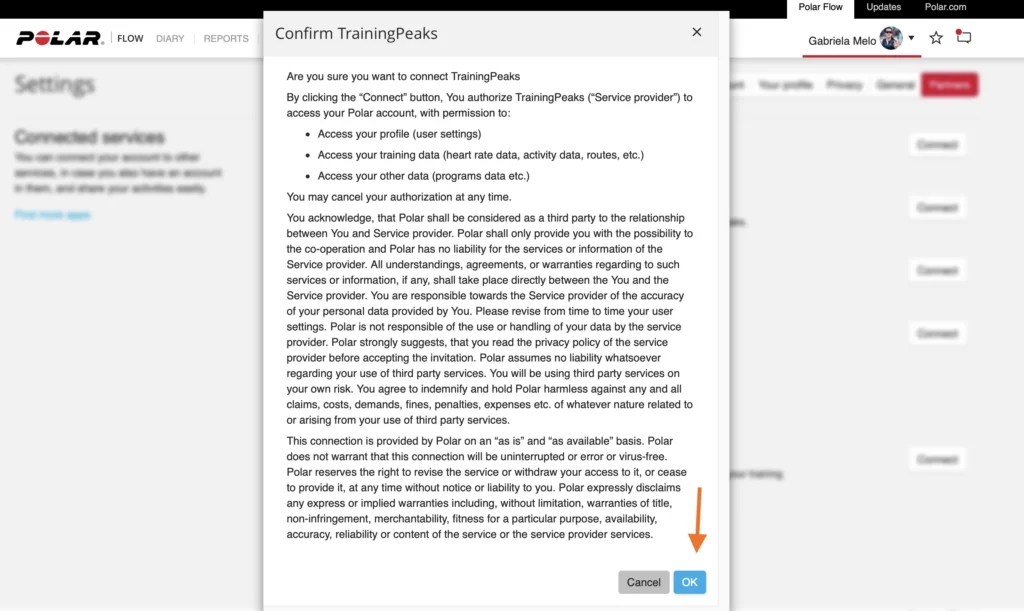 • Você precisará aceitar um termo que aparecerá na tela e depois será direcionado para o site do Training Peaks para acessar sua conta;