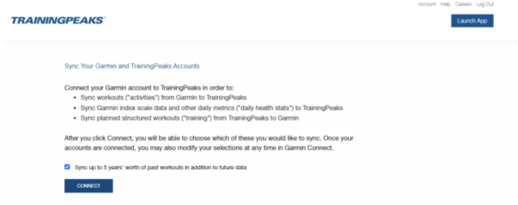 • Na sessão de conexões, escolha o aplicativo do Training Peaks e clique em “connect”